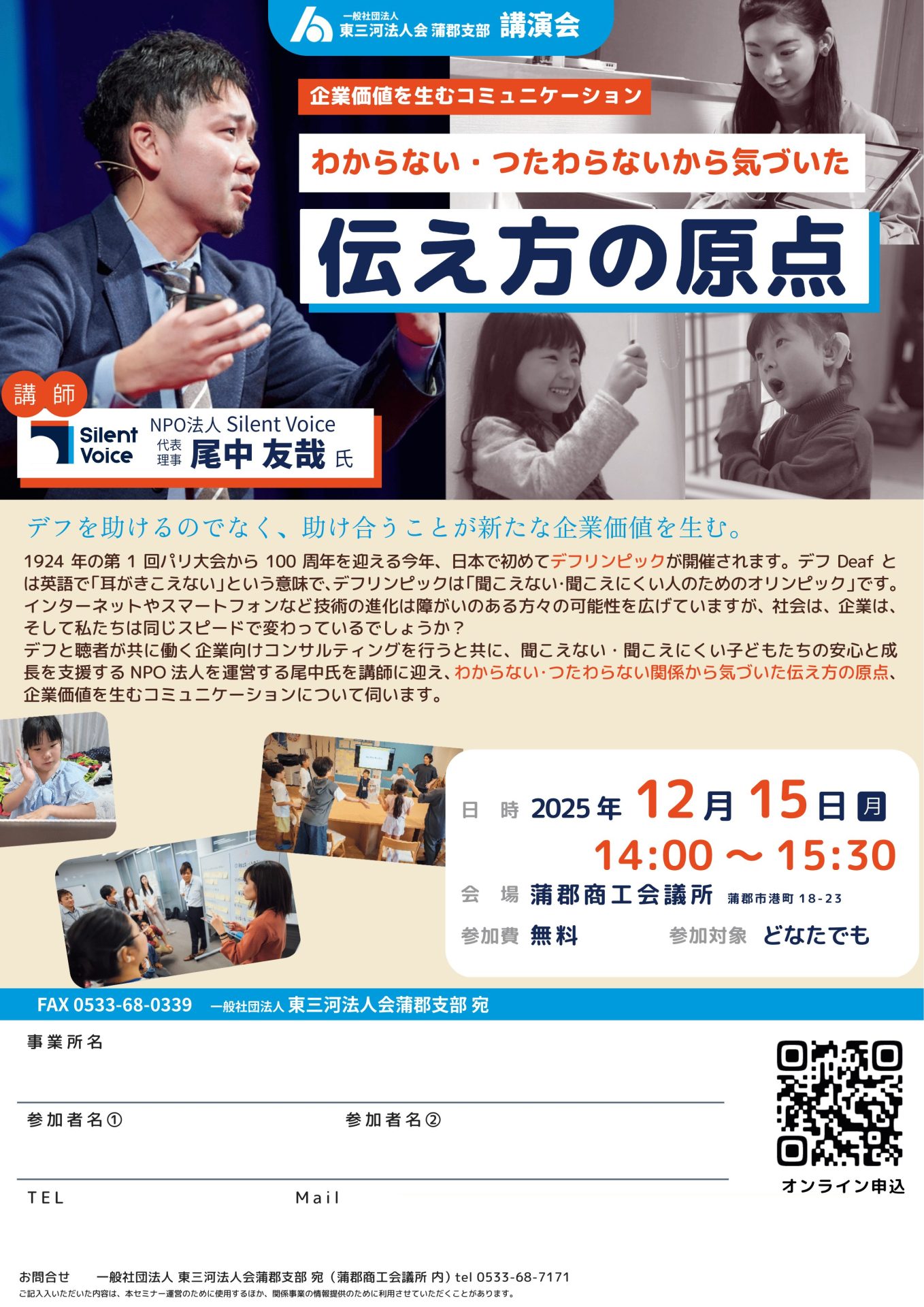 デフと聴者が共に働く企業向けコンサルティングを行うと共に、聞こえない・聞こえにくい子どもたちの安心と成長を支援するNPO法人を運営する尾中氏を講師に迎え、わからない・つたわらない関係から気づいた伝え方の原点、企業価値を生むコミュニケーションについて伺います。