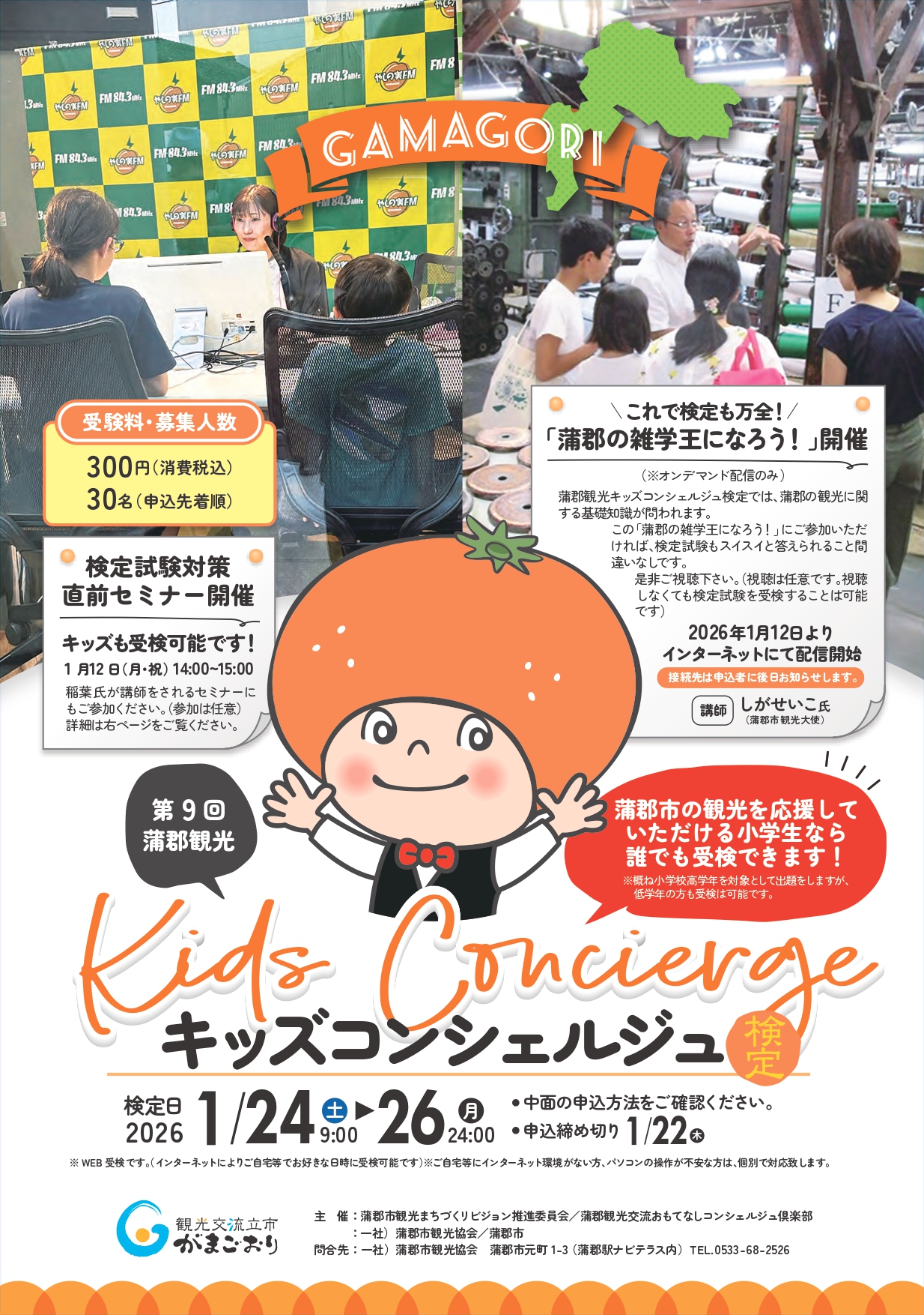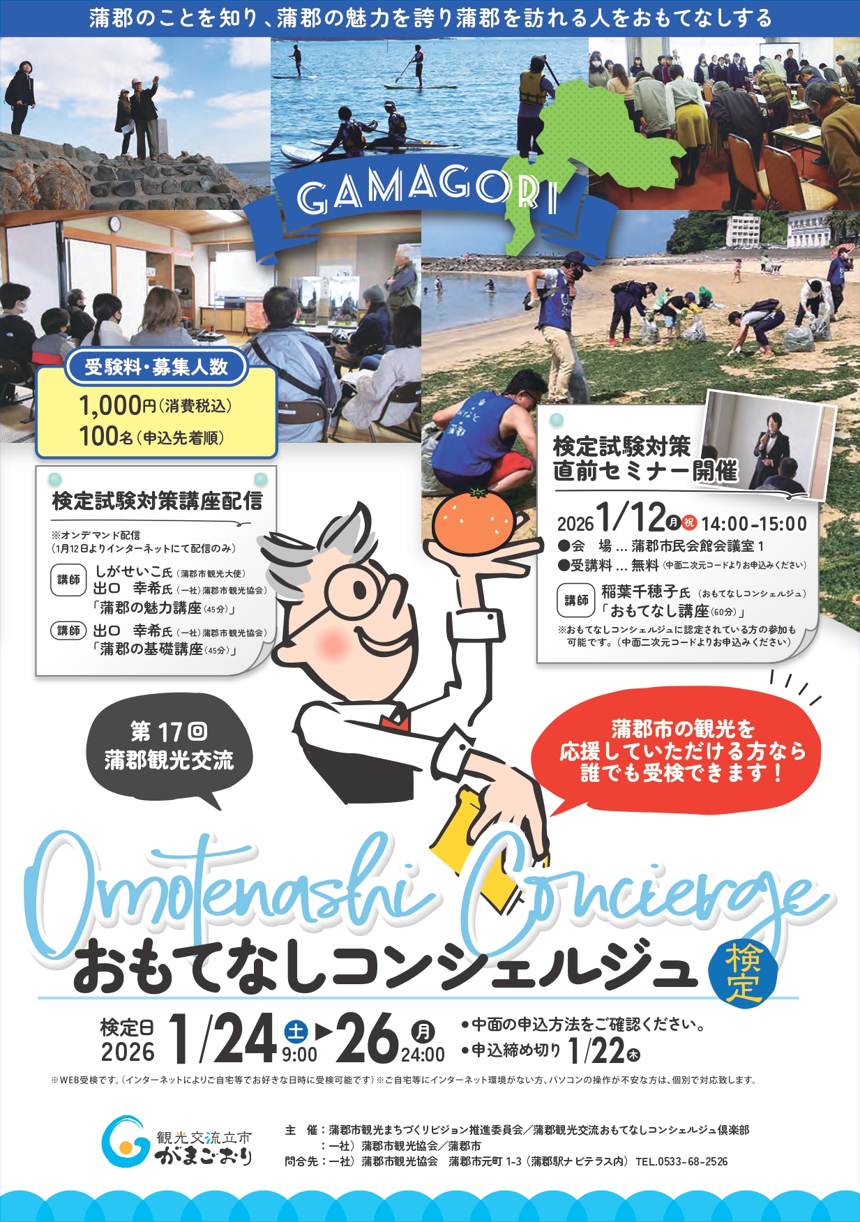 本検定では、蒲郡のことを知り、蒲郡の魅力を誇り、訪れた方をおもてなしすることのできる方を、「蒲郡観光交流おもてなしコンシェルジュ」として認定し、来訪者を気持ちよくお迎えする模範となりご活躍いただくことによって、蒲郡を素晴らしい観光交流都市に育てていくことを目的に開催されています。