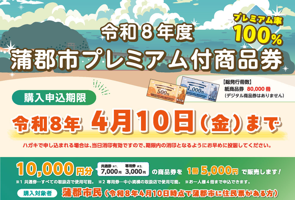 | 申込方法 | ①本サイトの下記ボタンから申請 ②申込ハガキに必要事項をご記入の上、蒲郡商工会議所へ郵送 |