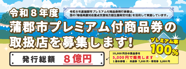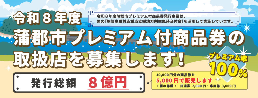 | 取扱店 申請期間 | 令和8年4月30日(木)まで(以降随時受付) ※令和8年4月30日(木)までに申込を完了(申込用紙の場合は必着)された事業者様は、「蒲郡市プレミアム付商品券取扱店一覧」(紙媒体)に掲載させていただきます。 ※令和8年4月30日(木)以降に申込を完了された事業者様は、蒲郡市プレミアム付商品券専用ウェブサイトに店舗名を掲載して随時更新いたします。 |