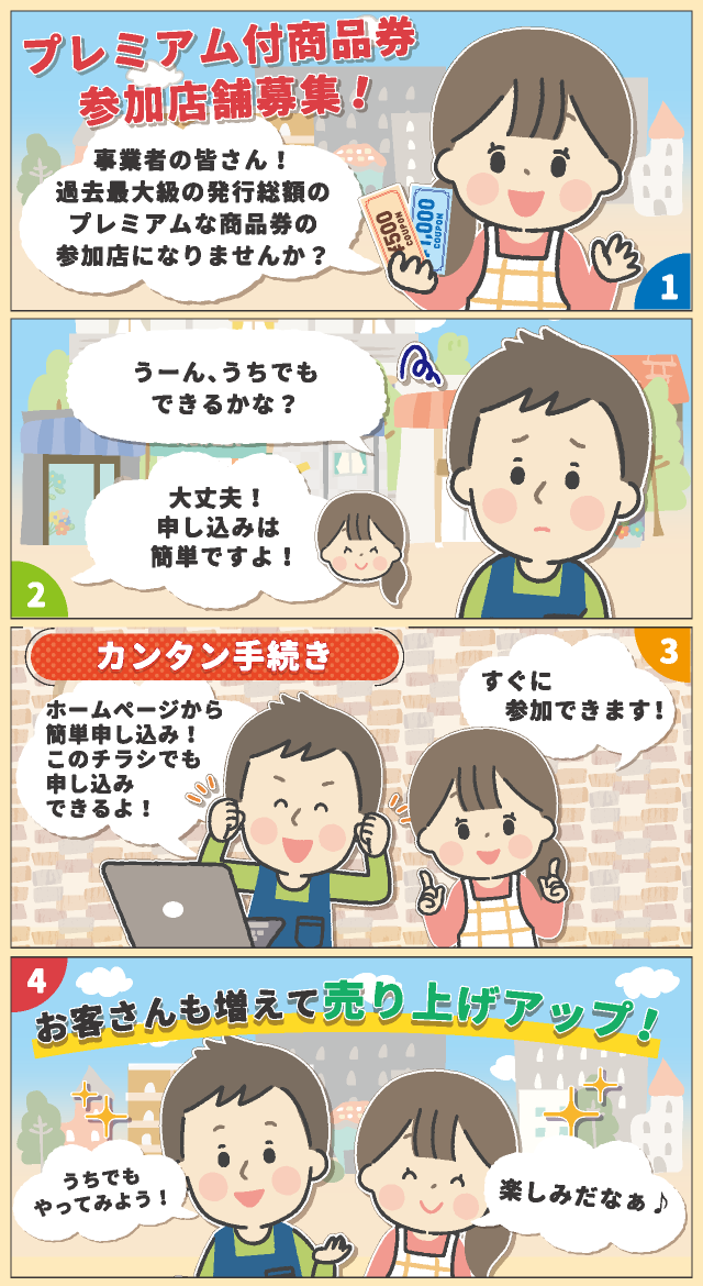 | 商品券名 | 10,000円分の商品券を5,000円で販売(合計8万冊) 共通券 7,000円(全ての店舗で使用可) 専用券 3,000円(小中規模店舗で使用可) |